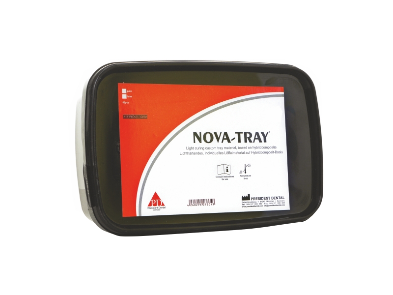 NOVA-TRAY Plaque de prise d’empreinte à polymérisation par lumière NovaTray est un matériau de prise d’empreinte transparent, radiopaque et thixotrope à polymérisation par lumière, sous forme de plaques contourées pour un travail précis pour les couronnes, les bridges et la technique prothétique totale, ainsi que pour la fabrication de bases pour les motifs de morsure.